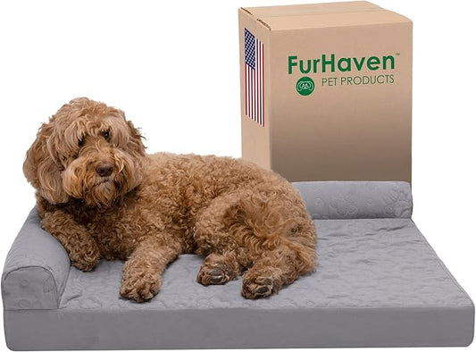 Furhaven Orthopedic Dog Bed for Medium/Small Dogs w/ Removable Bolsters & Washable Cover, For Dogs Up to 35 lbs - Plush & Almond Print L Shaped Chaise - Gray Almonds, Medium