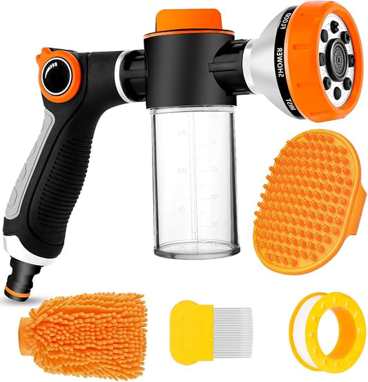Upgrade Dog Washing Hose Attachment with Soap Dispenser, Dog Bath Hose Attachment with Pet Bath Brush Car Wash Mitt and Dog Comb for Watering Plants, Lawn, Showering Pet(Orange)