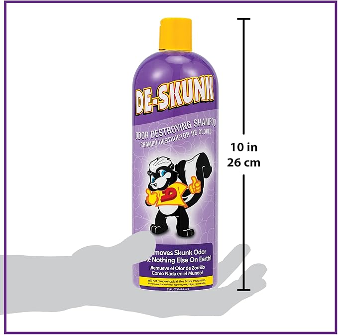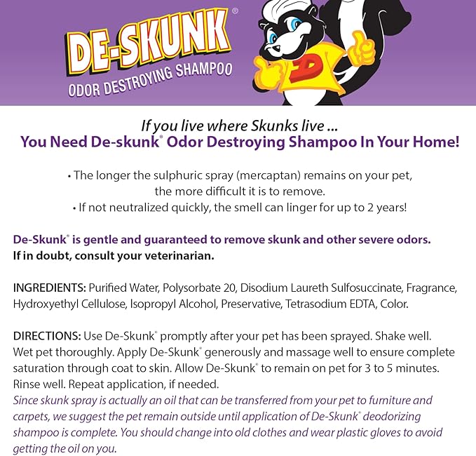 • EASY TO USE – Use De-Skunk Shampoo promptly after your pet was sprayed. Apply from tail to head, gently massage deep into coat and skin and allow De-Skunk to stay on pet for 3 - 5 minutes. Rinse well and repeat at least once or until odor is eliminated
