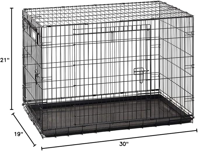 • 30 Inch Dog Crate: Measures 30" x 19" x 21" & weighs 19.5 lbs. Rounded corners eliminate sharp edges prevent snags and non-skid rubber feet protect floors. If in doubt, buy a size up. This collapsable dog crate is easy to store & transport
