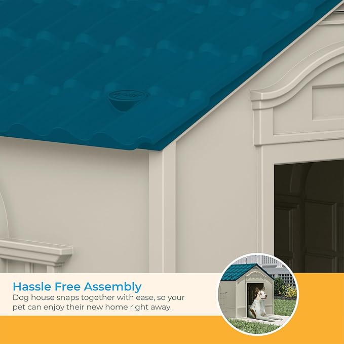 Suncast Deluxe Dog House for Dogs up to 100 Pounds with Removable Roof, Vents, Crowned Channeled Floor, and Personalization Labels, Taupe/Blue