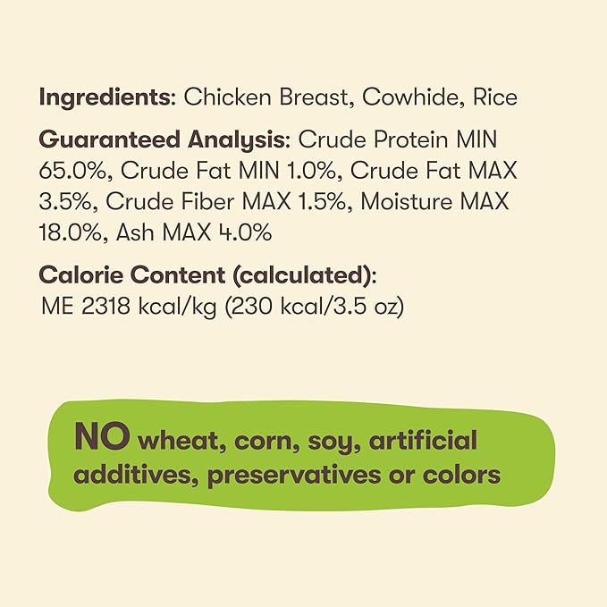 • Ingredients - Tantalizing treat made from naturally delicious chicken breast fillets and brown rice formed into crunchy, bite-sized balls on a chewy rawhide stick.