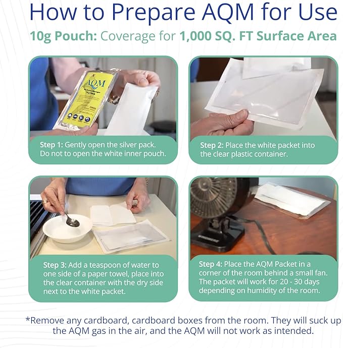 • How to Use: Place the AQM Packet in a corner of the room and open the silver packet; Remove the white pouch and place it back into the clear, self-adhesive protector; Place a slightly moistened paper towel in the protector, then place the protector pack behind a small 4″ diameter fan; The room will be completely deodorized and the packet can produce the gas up to 20-30 days; Depending on the odor, the smell could be gone for years
