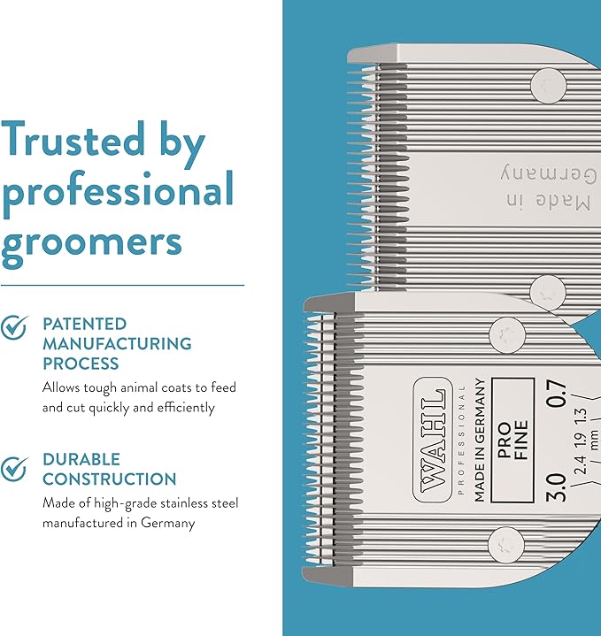 • Made in Germany of high-grade stainless steel, Wahl blades are built to perform while you're grooming, clipping, or trimming your animal Measures 1 25 by 1 5 by 0 5 inches; weighs 0 069 ounces