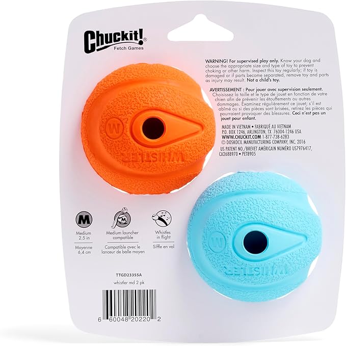 • Whistles When Launched: This 2.5" dog ball is designed with four sound holes that create a whistling sound, making fetch more exciting for dogs. Recommend using any size Medium Chuckit launcher; casually tossing The Whistler will not yield loud whistles