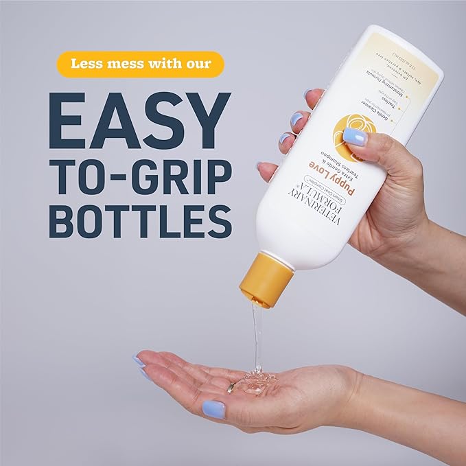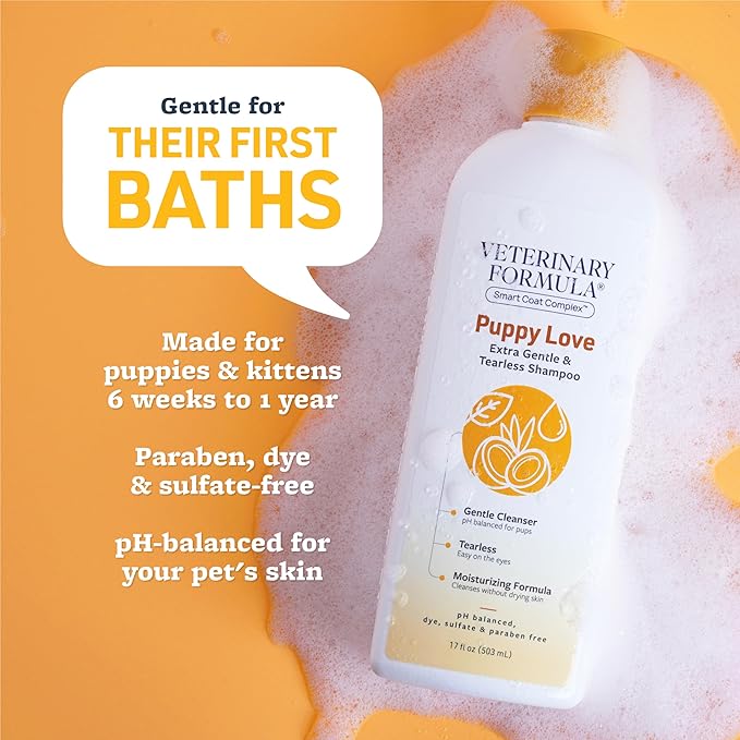 • EXTRA GENTLE – Recommended by vets for puppies first year, Veterinary Formula Solutions Puppy Love Extra Gentle Tearless Shampoo is sulfate and DEA-free. This puppy shampoo cleanses without drying out delicate skin and leaves coat soft and fluffy