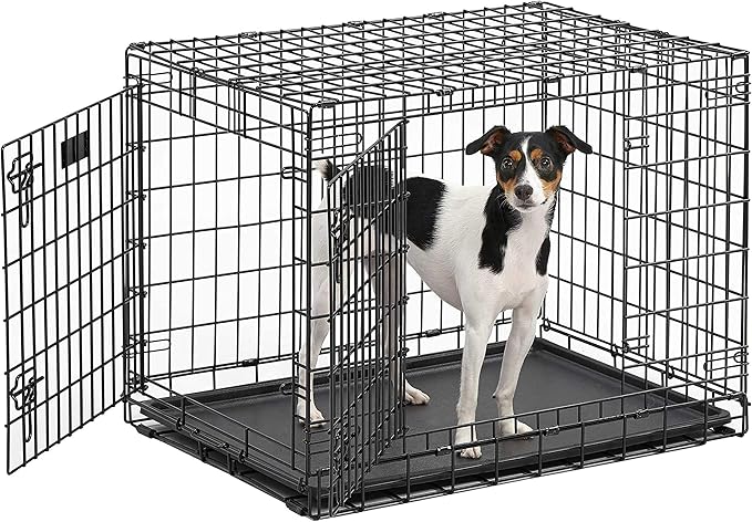 • Double door heavy-duty folding metal dog crate | Includes free divider panel, leak-proof plastic pan, a strong carrying handle, rubber feet to protect floors
