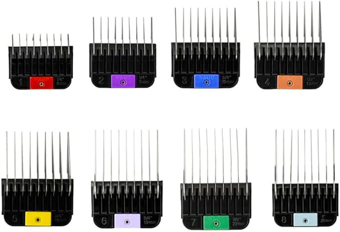 • Includes eight color-coded stainless steel guides in sizes #5 (1/8 inch cut length), #4 (1/4 inch), #2 (3/8 Inch), #1 (1/2 inch), #0 (5/8 inch), #A (3/4 inch), #E (1 inch), and #C (7/8 inch)