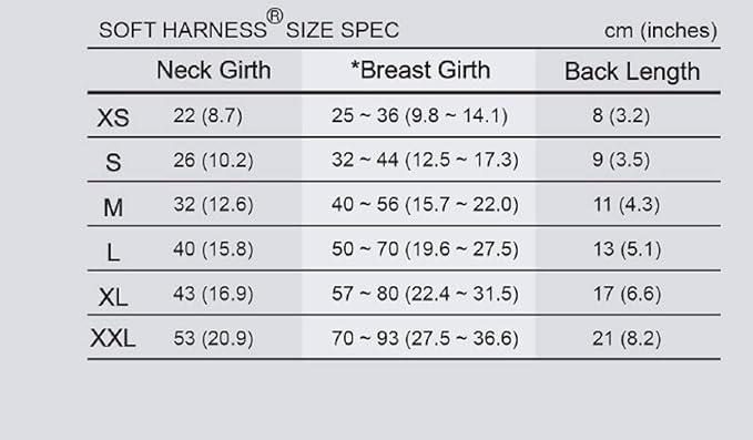 This size XXS harness is perfect for my small, 3-month-old puppy. The neck and chest measurements fit perfectly! It's easy to use, and the color is adorable. The padding is secure yet comfortable for him, and it's super easy to wash. I also bought the matching leash and love them both!