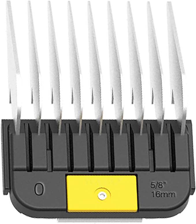 • Color-coded and easy to snap-on stainless-steel attachment guide comb offers a #0, 5/8-inch / 16 millimeter cut length with a yellow color
