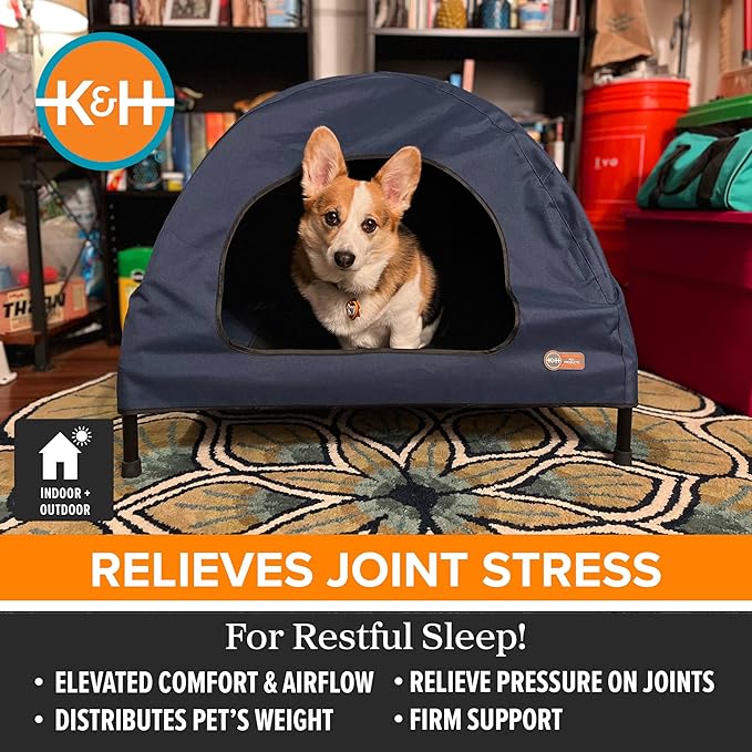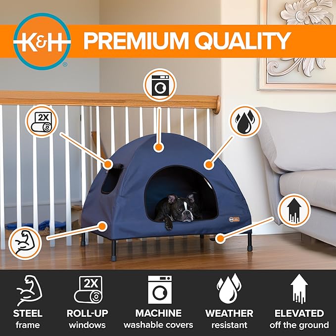 K&H Pet Products Pet Cot House for Medium Dogs, Outdoor Elevated Dog Cot House, Enclosed Canopy, Window Flaps for Air Flow, Washable Cover, Raised Metal Frame, Collapsible - Medium 32 X 25in Blue
