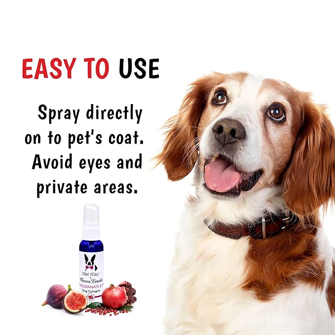 Warren London - Wet Kiss Dog Cologne, Long Lasting Dog Spray, Dog Deodorant to Remove Odor from Stinky Dogs, Pomegranate & Fig, 2 Ounce Bottle