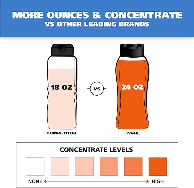• Less is More - Wahl has a higher concentrate of coconut derived sodding agent, which means you don’t have to use as much as other dog shampoos. A little bit of shampoo goes a long way and provides a rich lather that’s easy to rinse off