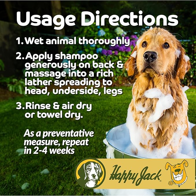 • APPLICATION. Wet dog and apply a generous amount of shampoo into the skin and massage in. Rinse and dry. Repeat every 2-4 weeks if symptoms occur.