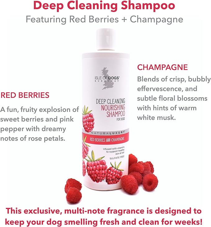 • ODOR NEUTRALIZING: This gentle & deep cleaning dog shampoo features our signature red berries and champagne fragrance and contains natural odor neutralizers to leave your pup smelling clean & fresh