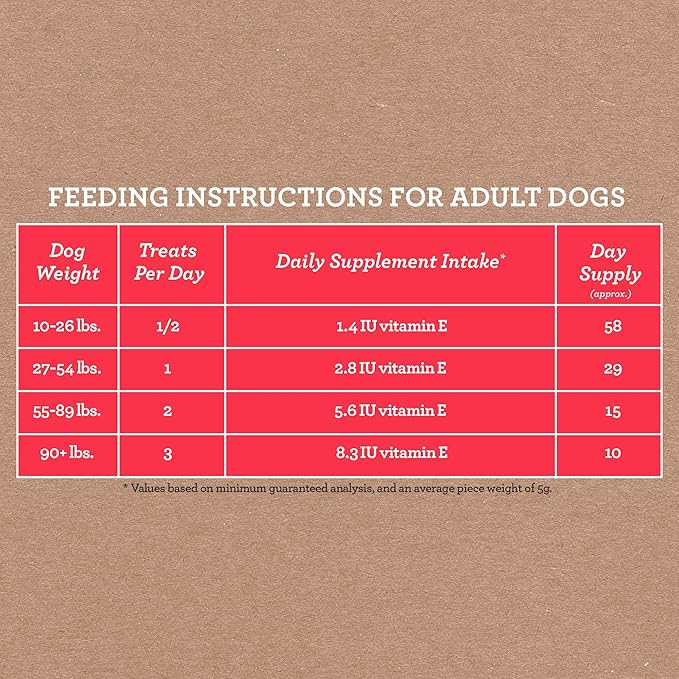 • Soft-textured treats with a daily measured dose of supplementation for your dog’s weight