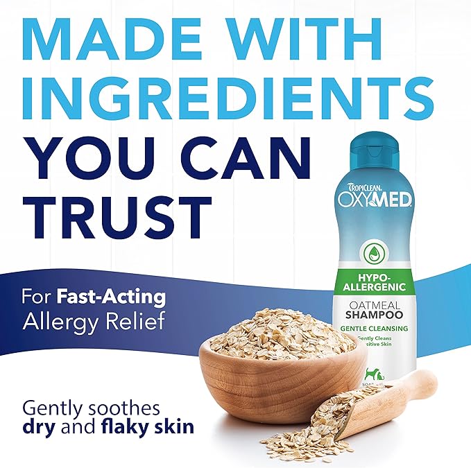 TropiClean OxyMed Hypoallergenic Dog Shampoo for Allergies and Itching, Skin Soothing Shampoo for Pets with Sensitive Skin, Tearless, Cat Safe, 20oz.