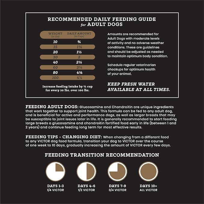 • HIP & JOINT HEALTH: VICTOR Performance dog food is designed with added glucosamine and chondroitin to support hip and joint health in active adult dogs