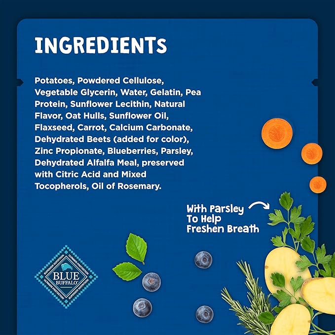 • HEALTHY, WHOLESOME INGREDIENTS: Blue Buffalo dog treats contain no chicken (or poultry) by-product meals, and they are free from corn, wheat, and soy