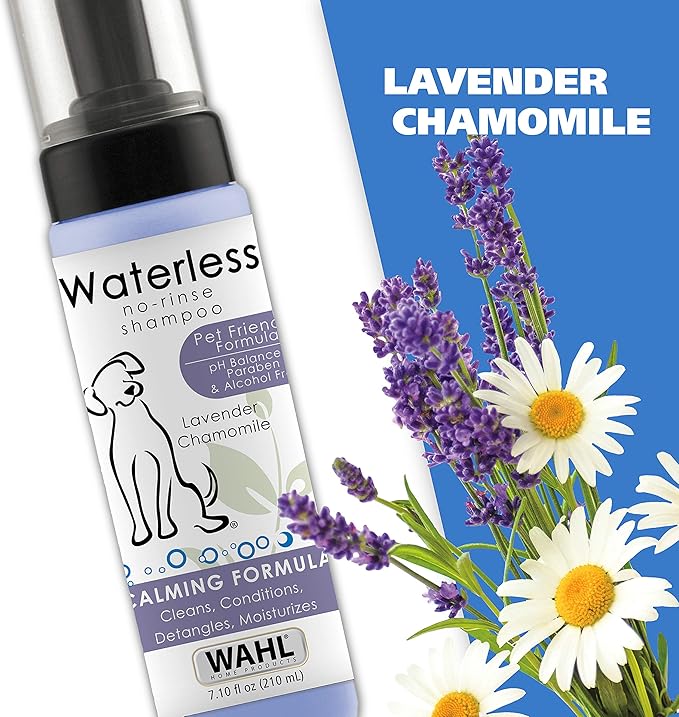 Wahl USA Pet Friendly Waterless No Rinse Shampoo for Animals – Lavender & Chamomile for Cleaning, Conditioning, Detangling, & Moisturizing Dogs & Cats – 7.1 Oz - Model 820014A