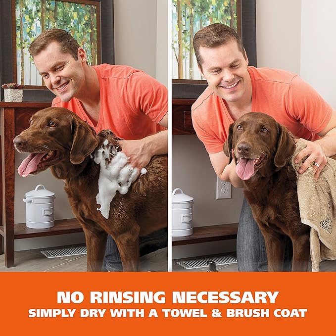 • No Rinsing Necessary – For dogs and cats that don’t like wet shampoos; no rinsing necessary, simply dry with a towel & brush coat