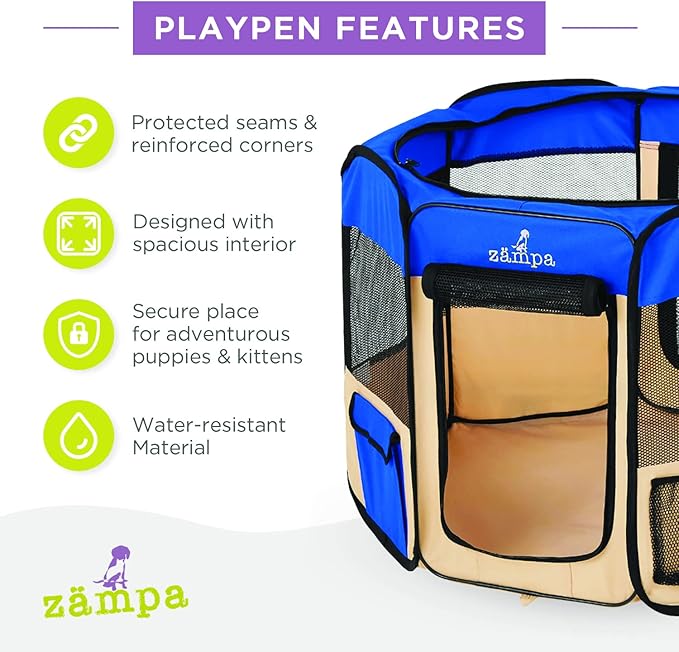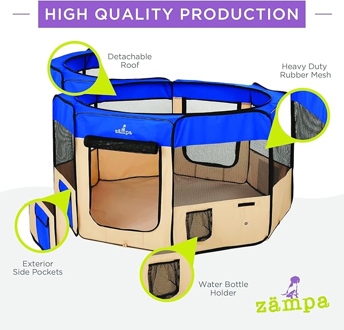• What To Expect From Zampa: Playpen, mesh top to zip on when needed, 4 metal spikes for outdoor safety, carrying case, and a commitment from our customer service team. Please don't hesitate to contact our customer service and BARK, we will make it right.