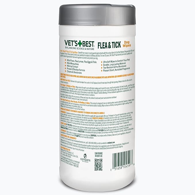 Vet's Best Flea and Tick Wipes for Dogs, Dog Wipes for Kennel, Flea and Tick Prevention, Plant-Based Formula, Pet Essentials, Made in USA, Certified Natural Oils, 50 ct