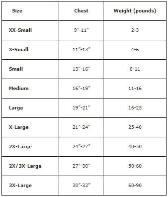 • SIZE X-SMALL (Chest 11”-13”) IMPORTANT: Measure the CHEST only, just behind the front legs.