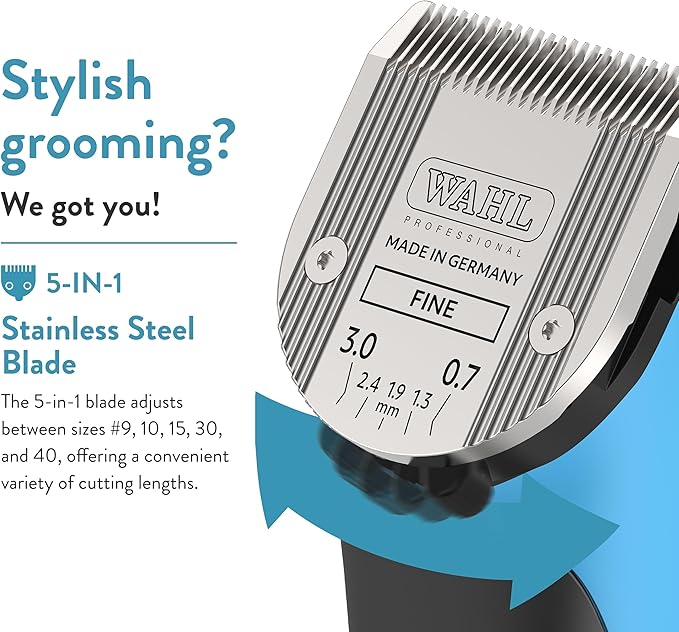 • Pet Grooming Clippers: Features an adjustable 5-in-1 Fine Blade (#9, #10, #15, #30, #40) for precise trimming across all hair types and cutting lengths