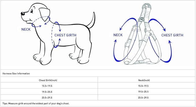 • Chest Girth 23.5-29.5", Chest Strap 7", Width 1", M/L; The chest strap is not adjustable. For a safe and fit purchase, be sure to check the neck and chest; A properly fitting collar and harness won't leave any room for your dog to chew.