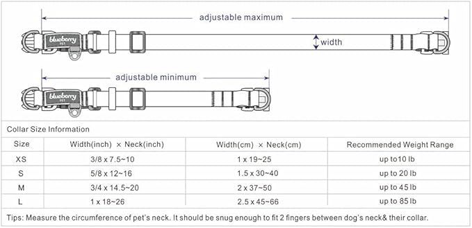 • Neck 14.5"-20", Width 3/4", Size Medium; The dog collar reflective does not stretch itself, please make sure leave ONLY 2 fingers between collar and dog neck. A properly fitting nylon dog collar and harness won't leave any room for your dog to chew