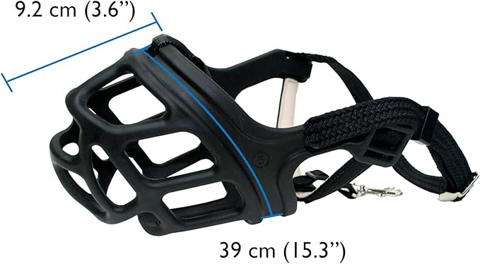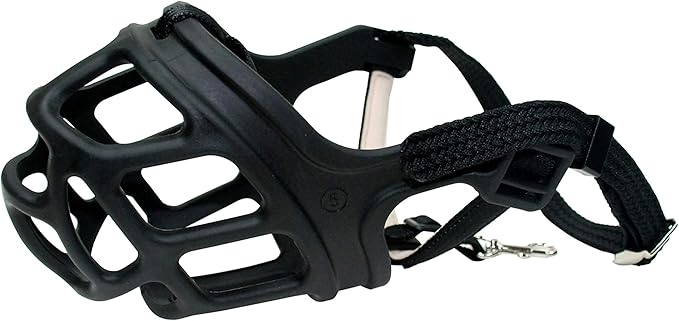 • Integrated Safety Hook: loops through dog's collar, ensures muzzle stays in place