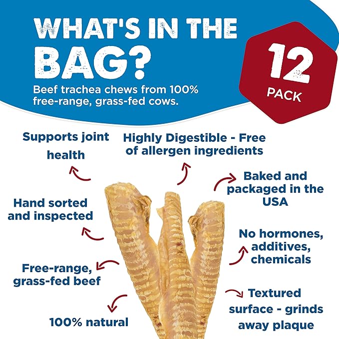 • Promotes Dental Health: Durable and long-lasting, our beef trachea scrapes away tartar and plaque through chewing action