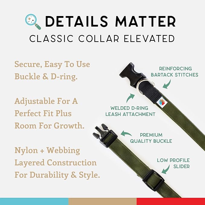 Dog Collar, Lightweight, Heavy Duty Dog Collar with Buckle, Fabric Pet Collar, Breathable & Adjustable Puppy Collar, Dog Collar for Large Dogs (Olive, Large - 14-24 Inch) - Wildebeest