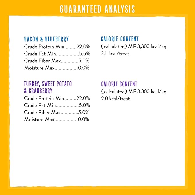 • All-Natural treats with the great taste of Bacon with the sweetness of blueberries taste that your dog will love PLUS Sweet Potato and Cranberry for a perfect variety.