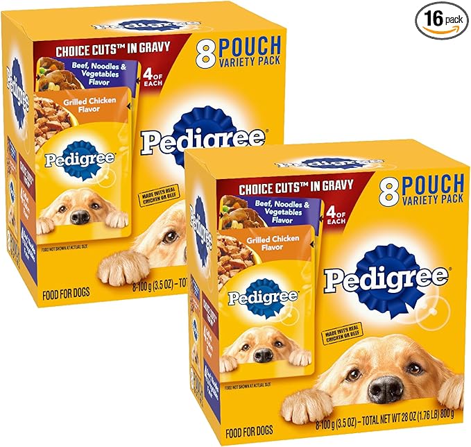 • 16-Count: Pedigree Choice Cuts in Gravy Wet Dog Food 16-Count Beef, Noodles & Vegetables and Grilled Chicken Variety Pack contains eight (8) 3.5 oz. Pouches of Beef, Noodles & Vegetables and (8) Grilled Chicken Flavors