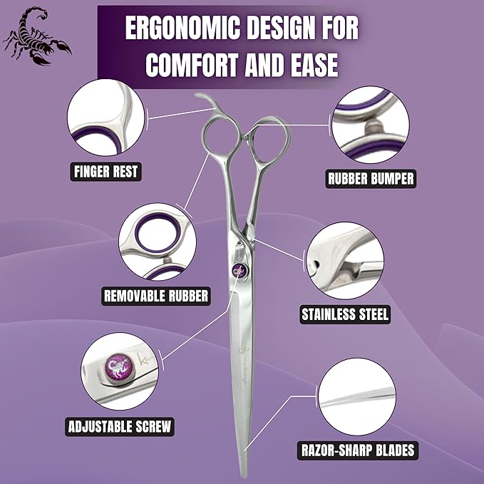 • BEST SELLING SHEARS: These Kenchii Scorpion dog grooming shears are our top selling grooming shears! Our extra durable grooming scissors are made with premium Japanese alloy steel with a semi-convex, micro serrated edge designed to reduce slippage and enhance cutting performance