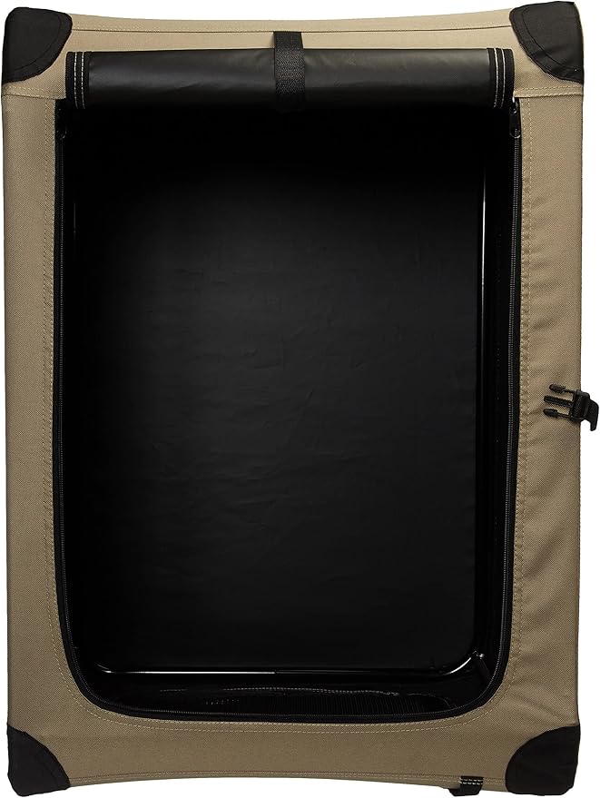• Soft-sided dog crate for keeping a furry 4-legged friend safe and comfortable when traveling, includes a Small dog crate made of tan polyester fabric and a lightweight yet sturdy frame