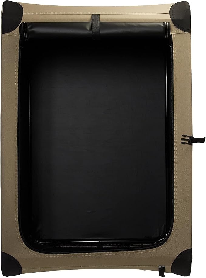 • Soft-sided dog crate for keeping a furry 4-legged friend safe and comfortable when traveling, includes a Small dog crate made of tan polyester fabric and a lightweight yet sturdy frame