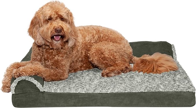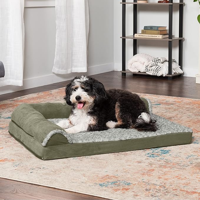 Furhaven Orthopedic Dog Bed for Large/Medium Dogs w/ Removable Bolsters & Washable Cover, For Dogs Up to 55 lbs - Two-Tone Plush Faux Fur & Suede L Shaped Chaise - Dark Sage, Large