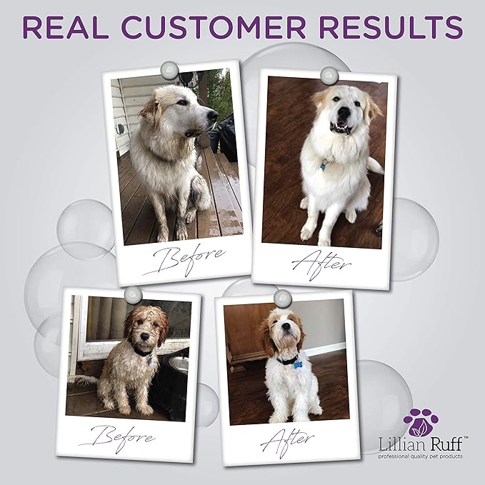 • Unrivaled Brightening Formula: Say goodbye to dull fur with our Coconut Brightening pet shampoo. Perfect for short to long coats, its unique formula produces a rich lather that rinses off effortlessly, brightening whites and enhancing coat colors. Unlike other whitening shampoos, Lillian Ruff Brightening Shampoo is suitable for all coat colors, ensuring a vibrant and refreshed look every time.