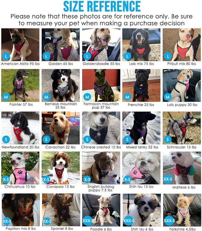 • 【Adjustable & Easy to Use】 --- The harness is easy to put on with two buckles on the chest part, and the four adjust buttons on the harness strap make it easy to adjust for a comfortable fit for small, medium, and large dogs. The breathable mesh chest vest harness is adjustable to relieve pressure and fit your pet perfectly.