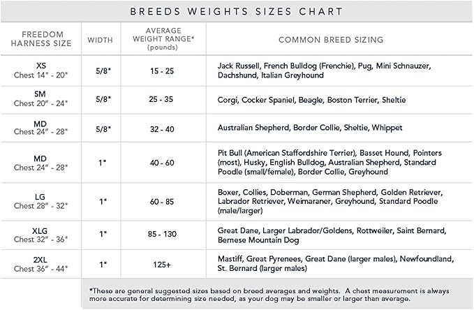 • 🐶 PROPER HARNESS SIZE: For ultimate fit and style, the freedom no-pull harness for dogs comes in various sizes and solid colors to cater to different dog breeds and body types. To get the correct sizing, use a soft measuring tape and measure around the largest part of the dog's chest. Get the smallest size that fits within the measurement.