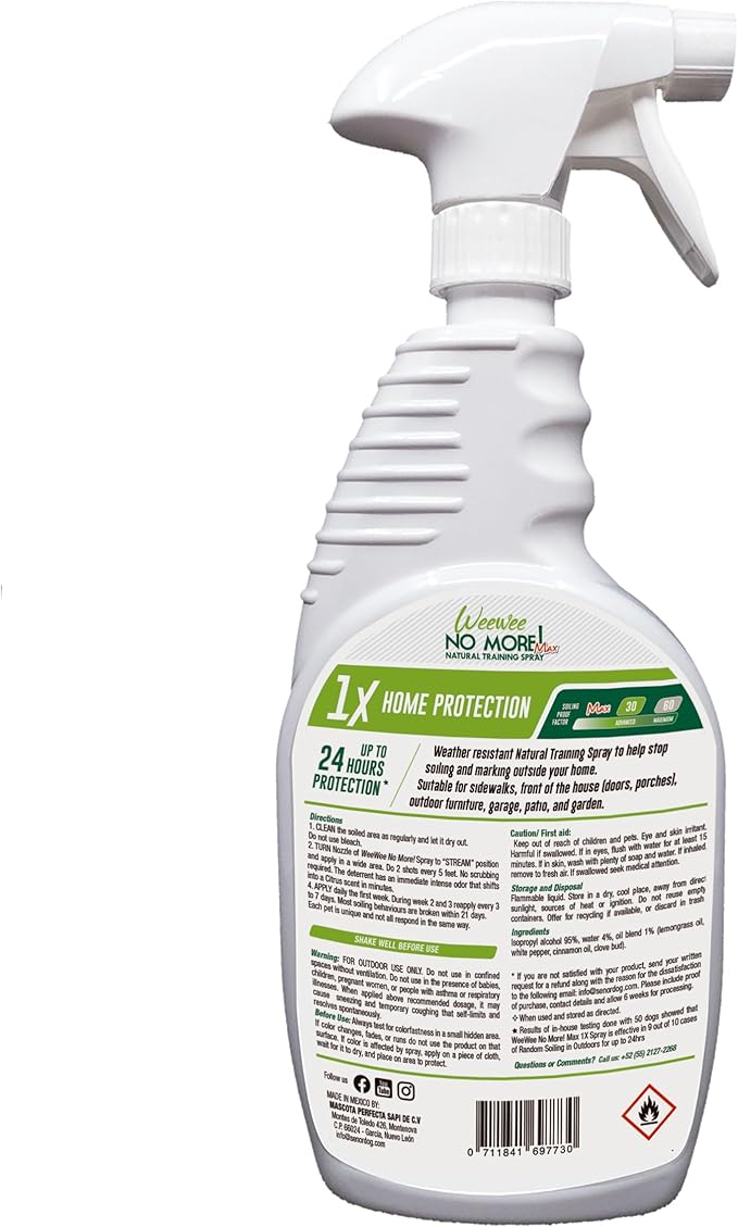 • 24 HOURS PROTECTION. WeeWee No More! MAX 1X Training Sprays has a Soiling Proof Factor of thirty (SPF=30). The SPF level indicates the power of a commercial training spray compared to the most frequently used homemade alternatives. An SPF-30 guarantees up to 24 hours° of continuous protection against Dogs Random Soiling in Outdoors. Used by professionals in Condo’s buildings, Gated communities, Hotels, and Sports Clubs.