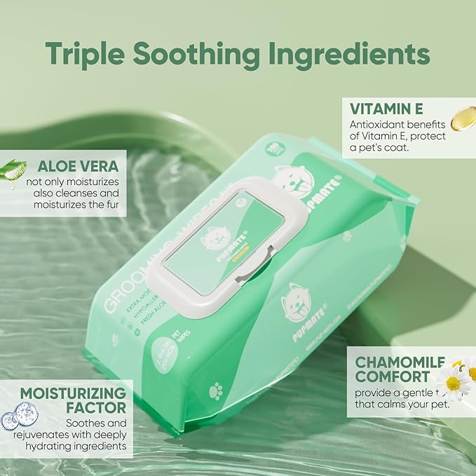 • GENTLE FORMULA: Rooted in the essence of natural goodness, PUPMATE pet wipes are crafted with ingredients like soothing aloe vera and vitamin E. Our pet wipes for dogs and cats symbolize gentle affection for your pets, delivering nourishment and care with each use. Vitamin E, a cornerstone of our formula, preserves healthy skin, embodying our commitment to the holistic well-being of your beloved companion