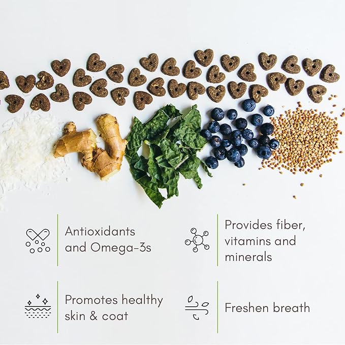 • PLANT POWERED INGREDIENTS: Carefully made with buckwheat flour, coconut flakes, blueberries, coconut oil, kale, ginger, and mixed tocopherols (to maintain the freshness). Easy to digest with highly soluble ingredients leading to a balanced nutrition for all-size dogs.