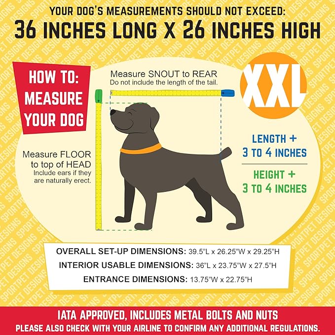 • Your dog’s measurements should be under 36" L x 26" H for 2XL kennel