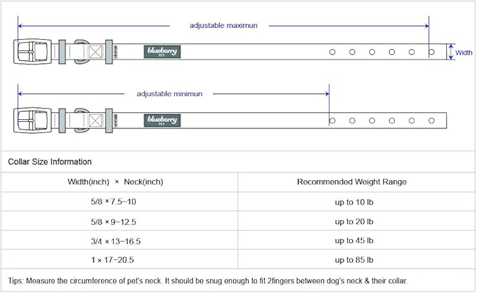 • Neck 9"-12.5", Width 5/8"; The collar does not stretch itself, please make sure leave ONLY 2 fingers between collar and dog neck. A properly fitting collar and harness won't leave any room for your dog to chew
