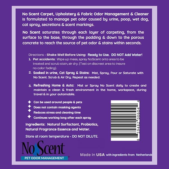 • No Masking Agents: Don't mask the pet odors in your space, reach them at the source instead; No Scent effectively manages odors trapped in fabrics caused by pet urine, pee, poop, wet dog smell, cat spray, scent markings, secretions & animal waste so you can relax in a refreshing space