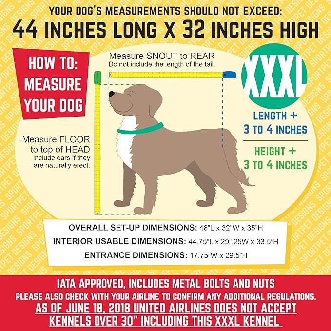 • Your dog’s measurements should be under 44” L x 33” H for 3X-Large kennel